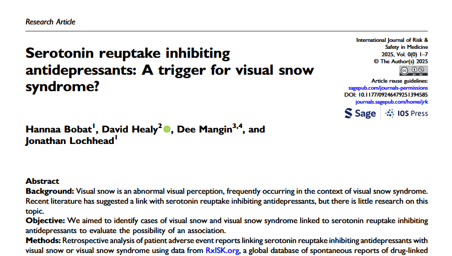 We are pleased to announce the publication of a new peer-reviewed article based on data from RxISK: “Serotonin reuptake inhibiting antidepressants: A trigger for visual snow syndrome?”